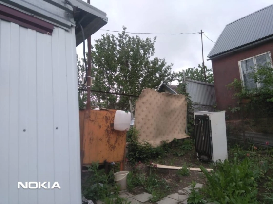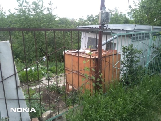 На территории есть дачный домик из железного вагончика оббитого сайдингом, который стоит на сваях, емкость для сбора дождевой воды.